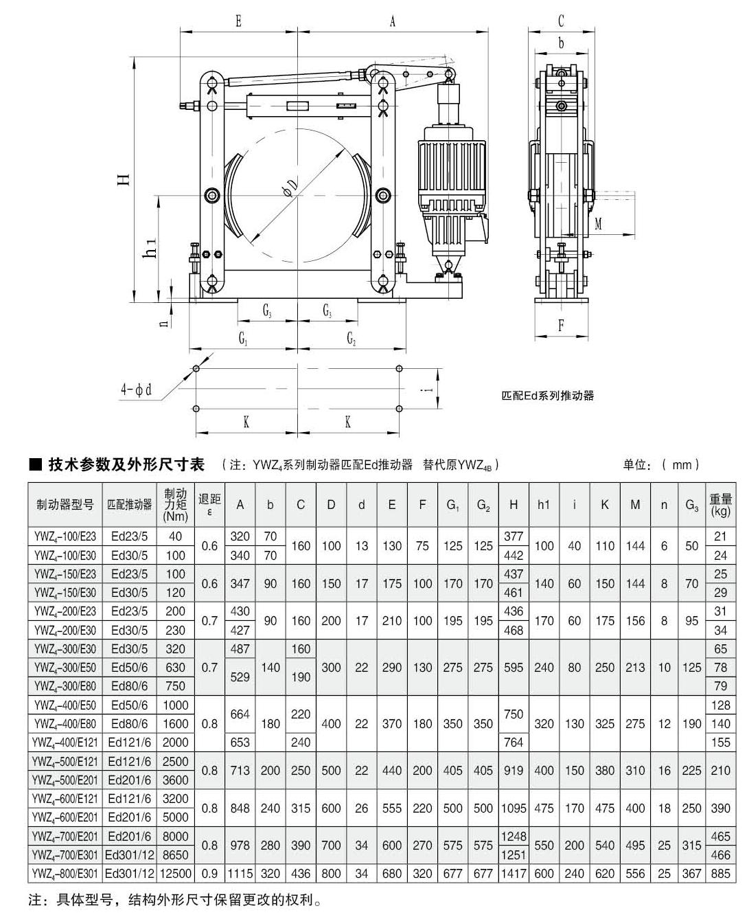 應用:YWZ4(YT1)系列電力液壓鼓式制動器,廣泛應用于有防爆要求的各種起重運輸、皮帶運輸、港口裝卸、冶金及建筑機械中各種機構(gòu)的減速和停車(維持)制動。YWZ4(Ed)系列電力液壓鼓式制動器,廣泛應用于有防爆要求的各種起重運輸、皮帶運輸、港口裝卸、冶金及建筑機械中各種機構(gòu)的減速和停車(維持)制動。符合標準:YWZ(YT1)系列電力液壓鼓式制動器的連接尺寸和制動力矩參數(shù)符合JB/ZQ4388-86標準,技術(shù)要求符合JB / T6406-2006標準。YWZ4(Ed)系列電力液