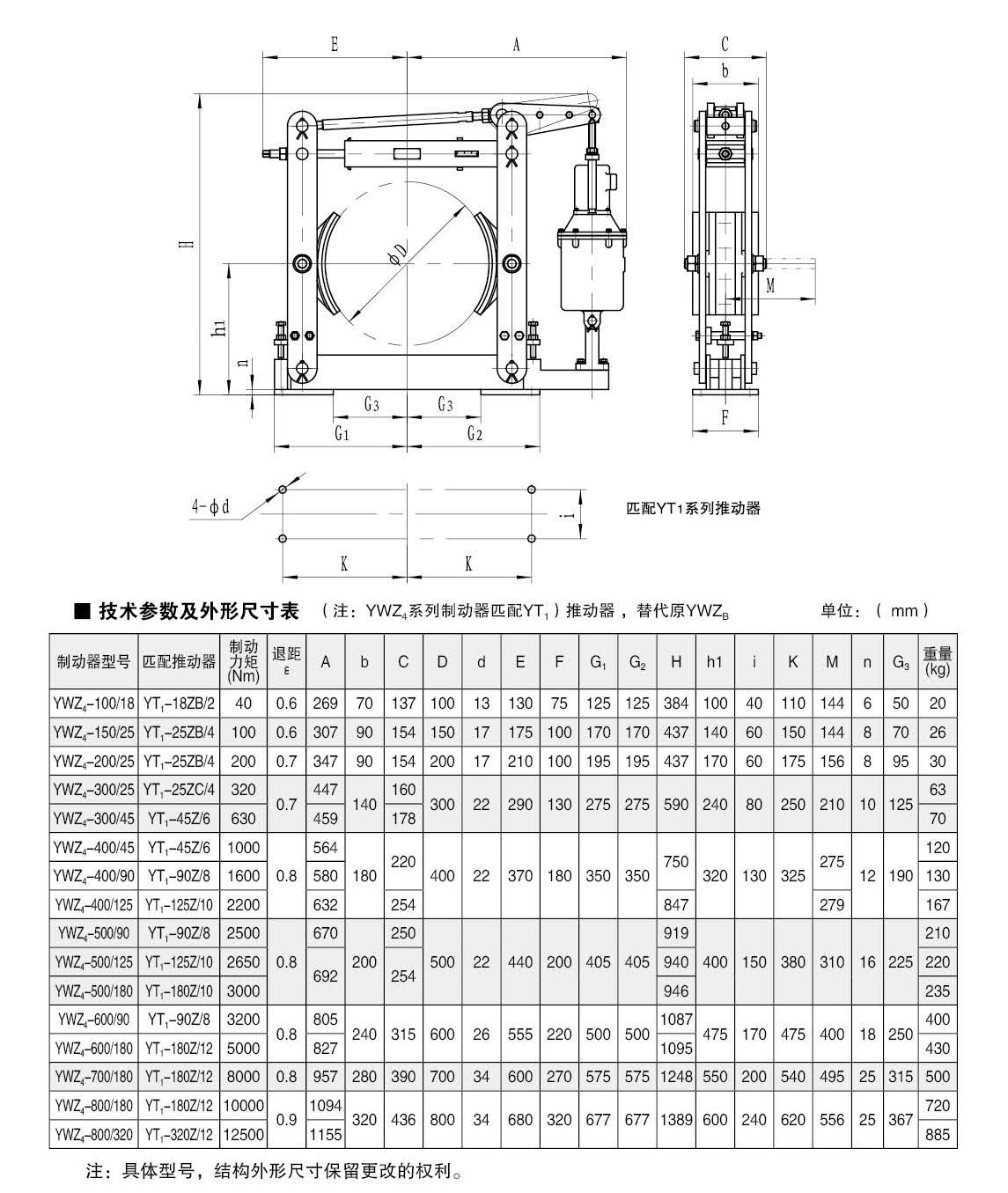 YWZ(YT1)系列電力液壓鼓式制動器的連接尺寸和制動力矩參數(shù)符合JB/ZQ4388-86標準,技術(shù)要求符合JB / T6406-2006標準。